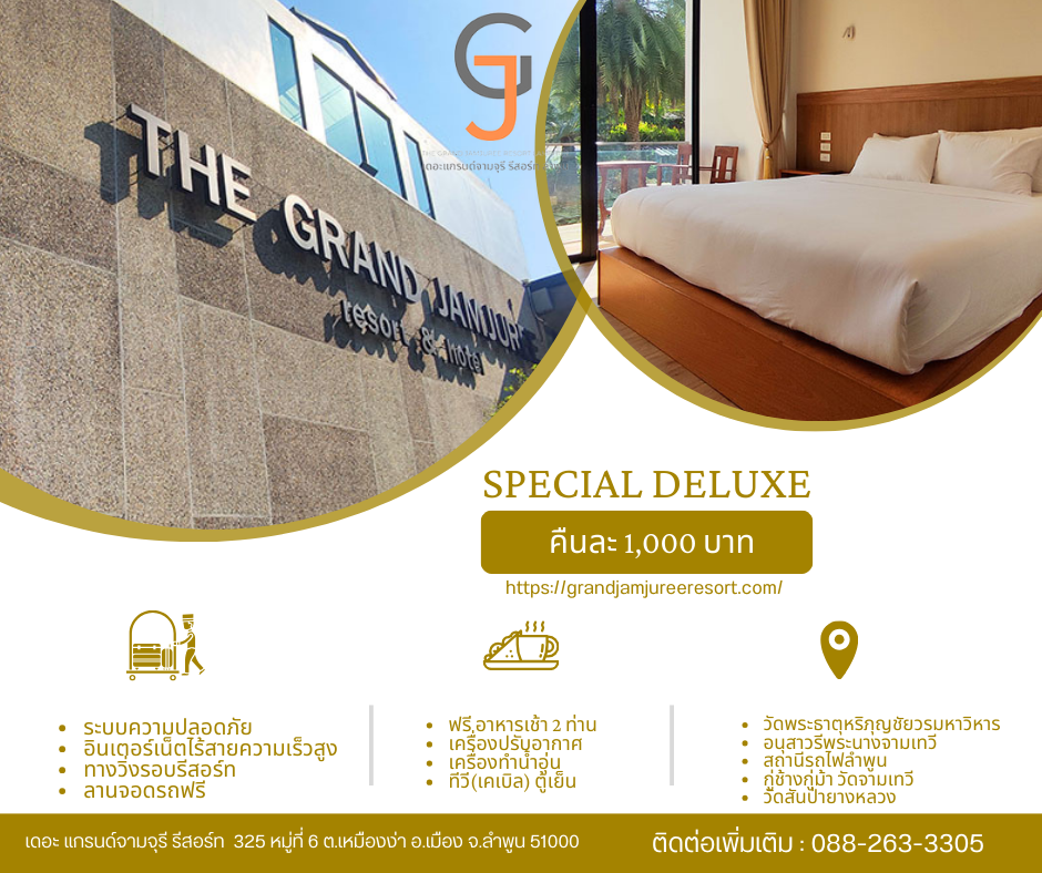 เดอะแกรนด์จามจุรี รีสอร์ท เป็นที่พักในลำพูนที่คุ้มค่ากับราคา เหมาะสำหรับผู้ที่มองหาที่พักคุณภาพดีในราคาประหยัด เดินทางสะดวก ใกล้สถานที่ท่องเที่ยวสำคัญต่างๆ